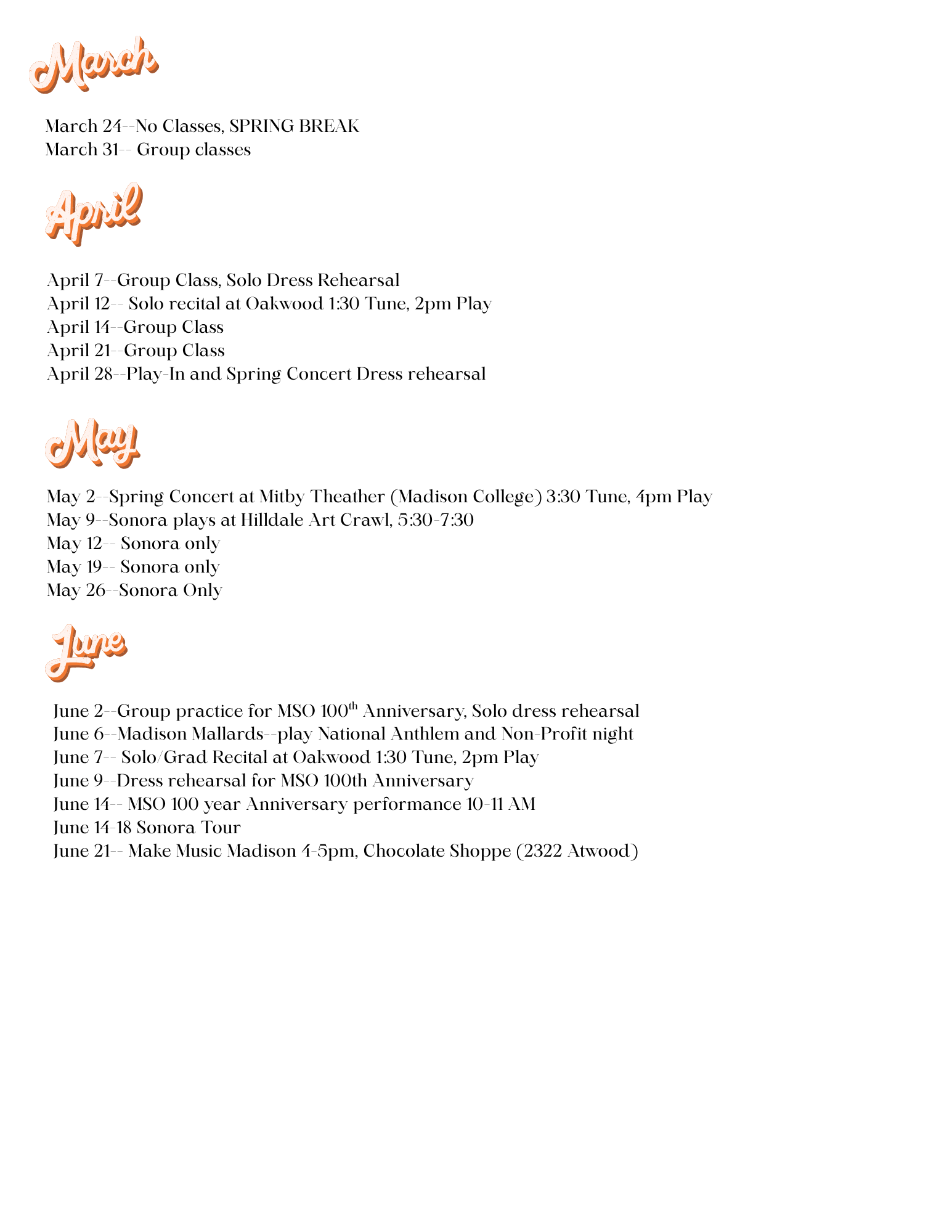 Updated Spring/Summer Calendar